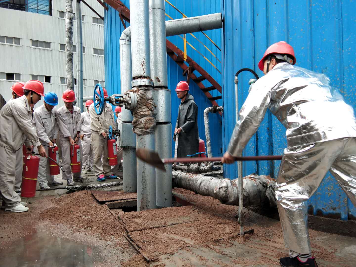 演練是以2#油罐回油管閥門前法蘭漏油,造成回油閥下方回油管道保溫棉浸油,導流溝內少量積油,遇高溫引起火災的模擬情景演練。演練過程中,各職能機構按照預案要求及時、有序、緊密配合,堅持“把演練當作實戰”,使事故得到有效控制,及時撲滅火情,避免災害的擴大,應急狀況消除。