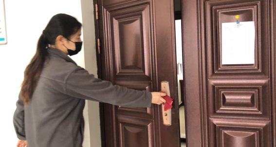 擦拭操作臺、門把手,工作的有條不紊。