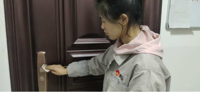 擦拭操作臺(tái)、門把手,工作的有條不紊。
