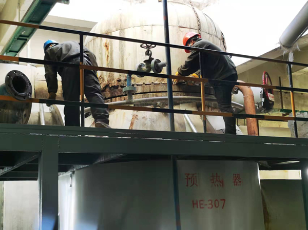 本次檢修的主要項目是對EV201、EV202、EV203、EV204、EV205、EV301、EV302、EV303效體進行刷洗效體并疏通加熱室,疏通300預熱器和HE307預熱器旁通閥、管道,檢查疏通34米205、301、302、303效體轉料環管沖洗水閥,檢查效體硝腳、循環管、夾套及轉料環管,對3#電除塵、3#爐空預器、3#爐過熱器和省煤器、3#爐脫硝、2#汽輪機油系統進行檢查、吹掃,檢查更換相關電氣儀表設備。