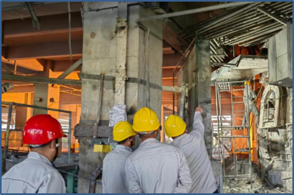 在爐壁修復現場,制作好的爐壁鐵、爐門、腳手架已被電石爐輻射熱炙烤的滾燙,檢修人員的手套阻隔不了那股熱流,他們不顧滾燙,依然堅持焊接、安裝,確保每一條焊縫安全牢靠。安全帽下每一張年輕稚嫩的臉龐,被汗水浸濕了無數遍,取下手套的手指上被汗水浸泡的發白,面對公司及裝置領導的關心,他們依然打趣的說到:“還好,不辛苦,干活五分鐘,流汗兩小時,我與烤肉的距離只差一撮孜然”。是的,在這種高溫下,我們的工人就是這么牛,這么樂觀,這么積極向上。他們拿出逢山開路,遇水架橋的闖勁,直面困難,迎難而上的干勁,百折不撓,馳而不息的韌勁,全力推動檢修工作順利完成。