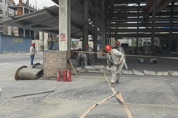 各應(yīng)急救援小組到達(dá)現(xiàn)場(chǎng),根據(jù)職責(zé)分工全力做好搶險(xiǎn)準(zhǔn)備工作。治安救護(hù)組按程序組織對(duì)現(xiàn)場(chǎng)設(shè)立警戒線(xiàn),做好人員控制及疏散、道路疏通工作,生產(chǎn)保障組落實(shí)其他裝置生產(chǎn)及現(xiàn)場(chǎng)防汛情況,同時(shí)組織進(jìn)行滅火;搶險(xiǎn)搶修組現(xiàn)場(chǎng)進(jìn)行圍堰堵水并疏通排水溝。搶險(xiǎn)搶修結(jié)束后,對(duì)事故隱患再次進(jìn)行排查、消除,并有序恢復(fù)現(xiàn)場(chǎng)生產(chǎn)作業(yè)。