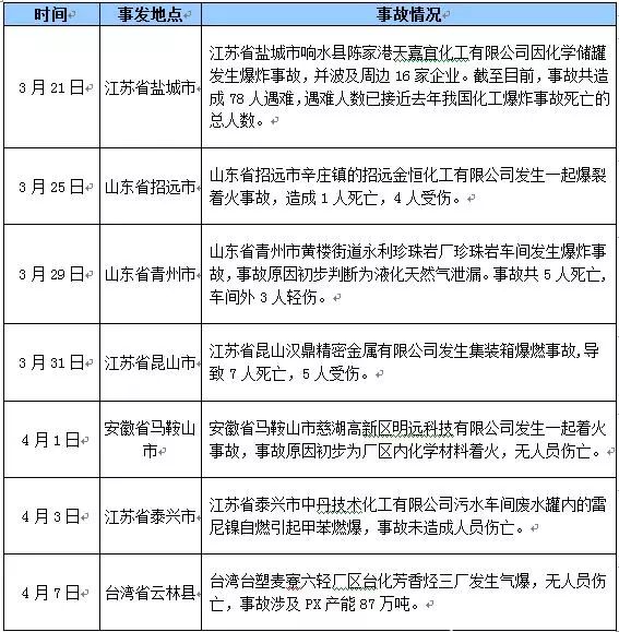 “3·21”特別重大爆炸事故發(fā)生以后,安全事故并沒有由此停歇,并再度頻繁上演。接連的爆炸事件引起政府和群眾的高度重視,事故發(fā)生后全國在化工領(lǐng)域開展危化品密集式排查,化工行業(yè)整治力度再上臺階。作為本輪事故多發(fā)地的江蘇省,亦于4月1日出臺史上最嚴(yán)的整治方案:要求到2020年底,江蘇省化工生產(chǎn)企業(yè)數(shù)量減少到2000家,到2022年,全省化工生產(chǎn)企業(yè)數(shù)量不超過1000家。4月5日,江蘇鹽城決定徹底關(guān)閉響水化工園區(qū),鹽城這一舉措,外界認(rèn)為無疑于是“壯士斷腕”。