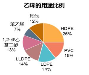聚乙烯(簡稱“PE”)以及聚氯乙烯(簡稱“PVC”),都與乙烯有相當密切的聯系。乙烯源于液化天然氣、液化石油氣、輕柴油、重油或原油等經裂解產生的裂解氣中分出,亦可以從焦爐煤氣中產生,還可以從乙醇脫水中獲得。在全球聚乙烯制作方法中,其中44%為原油產出石腦油制乙烯,43%為天然氣產出乙烷氣制乙烯,13%為煤炭/天然氣產出甲醇制乙烯。在乙烯的所有用途中,PE和PVC對乙烯的使用量最大,分別占比53%和15%。
