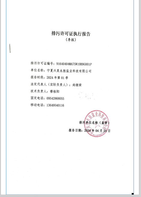 寧夏興昊永勝鹽業(yè)科技有限公司2024年第1季度排污許可執(zhí)行報告
